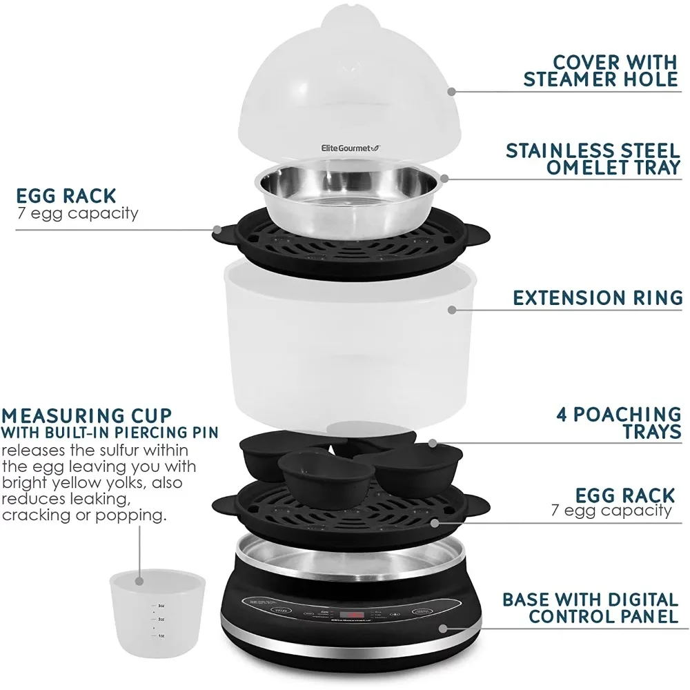 The Elite Gourmet programmable 2-tier egg cooker/steamer allows you to cook up to 14 eggs at one time. An included measuring cup allows you to determine the proper water level to consistently prepare eggs to your desired style, soft, medium, or hard boiled. Also included, 4 poaching trays and a stainless steel omelet tray for tasty Eggs Benedict or fluffy omelets. The built-in delay timer lets you delay your cooking up to 9.5 hours. In addition to cooking all types of eggs, there are 6 preset programs to cook omelets, steam vegetables, fish, chicken and rice.